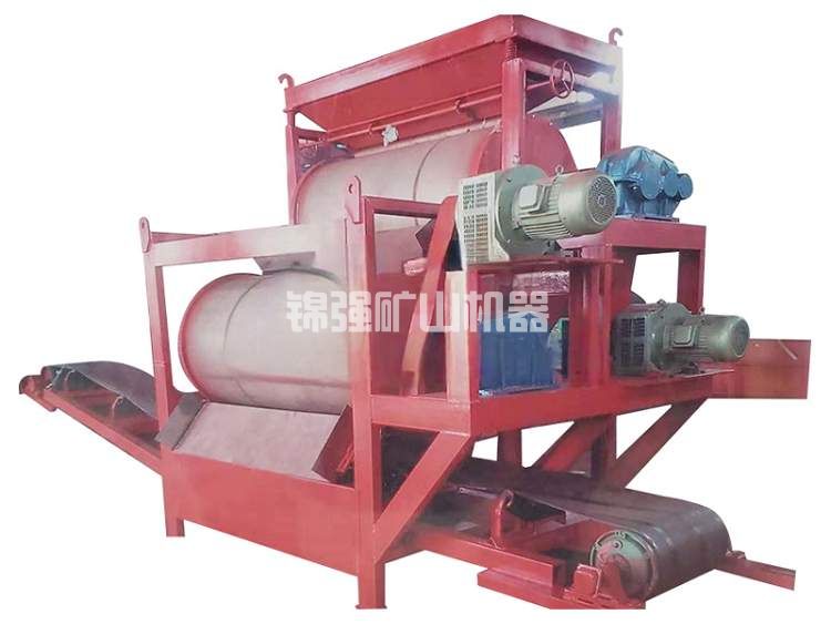 含有磁性物質(zhì)的非磁性物料經(jīng)過電磁振動給料機(jī)均勻的分布到強(qiáng)磁雙輥干式磁選機(jī)皮帶上;當(dāng)物料通過強(qiáng)磁輥時(shí),磁性物質(zhì)由于受磁力的吸附作用被吸附到強(qiáng)磁輥上,被皮帶帶入磁性物料集料斗中;非磁性物料及未被選凈的磁性物料隨著皮帶的轉(zhuǎn)動受重力作用,脫離磁場并下落到下一層皮帶上繼續(xù)選別;這樣,經(jīng)過幾道磁選之后就能選別出合格產(chǎn)品。